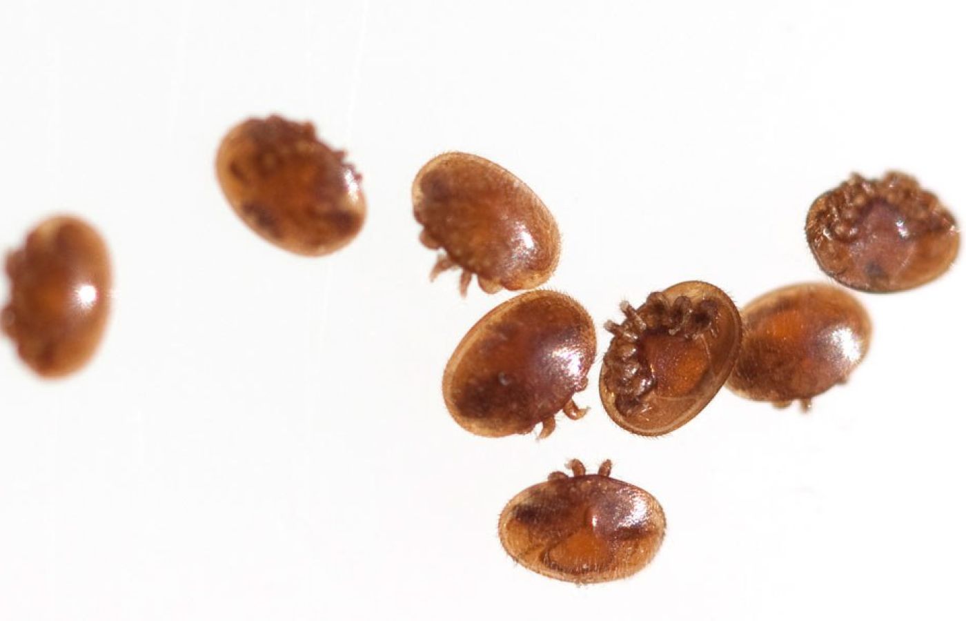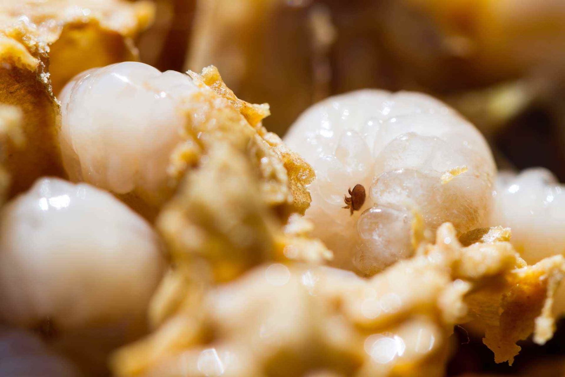 The Varroa destructor mite is a tiny parasitic mite and destroyer of honeybee colonies. They are small, reddish-brown, oval, and flat parasites roughly 1.1mm long and 1.5mm wide, and visible to the naked eye. It invades drone and worker brood cells (the hive's nursery), feeding and breeding on baby European honeybees. They directly inject viruses, can spread pathogens, and leave weakened hives vulnerable to secondary attacks by other pests, such as small hive beetles. Left unmanaged, varroa infestations can destroy entire colonies.